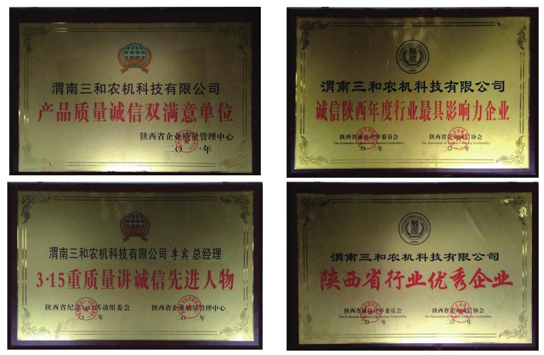 2012年4月渭南三和農機科技有限公司經銷的“一拖集團東方紅拖拉機”被渭南市消費者協(xié)會、渭南市農資協(xié)會、渭南電視臺評為“渭南農民信得過的農資品牌(農機類)”。